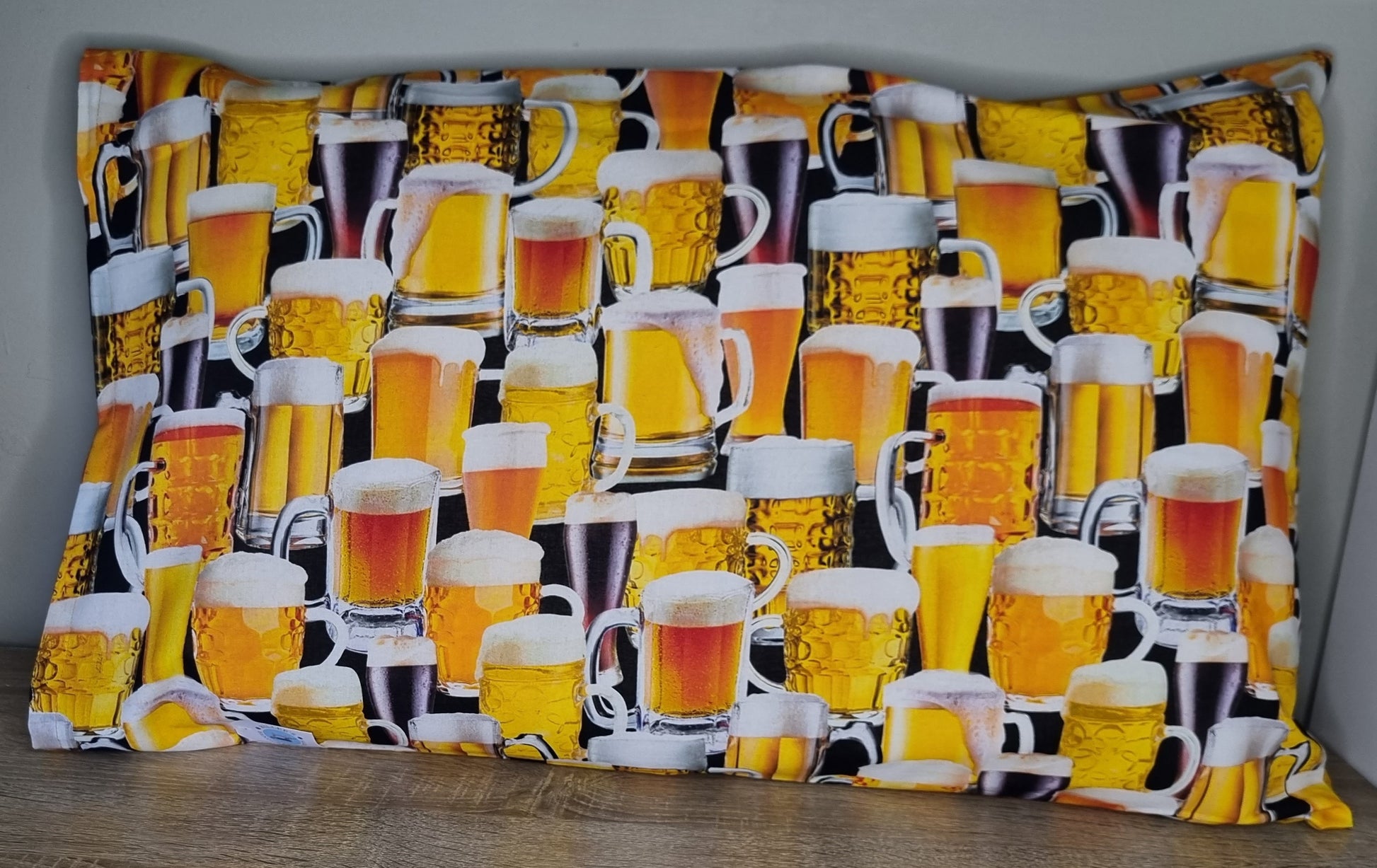 Standard sized Pillow case featuring Beer with a yellow/mustard coloured deign back