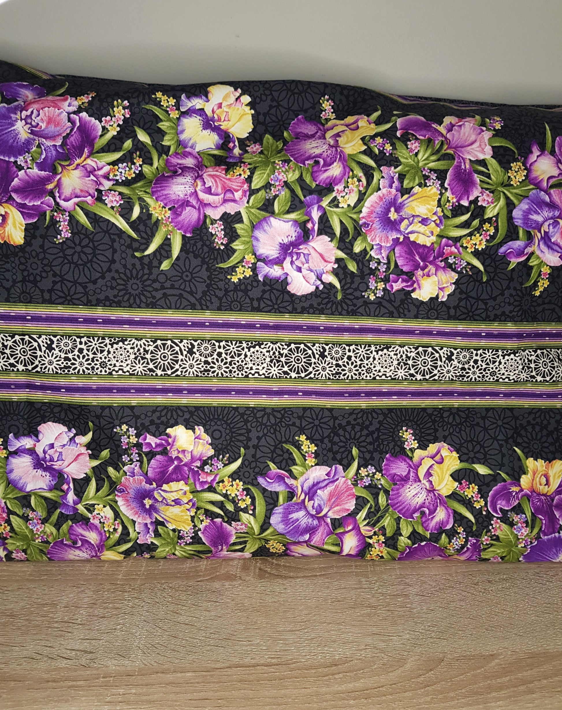 Purple irises on a standard sized pillow case with a black floral pattern back.