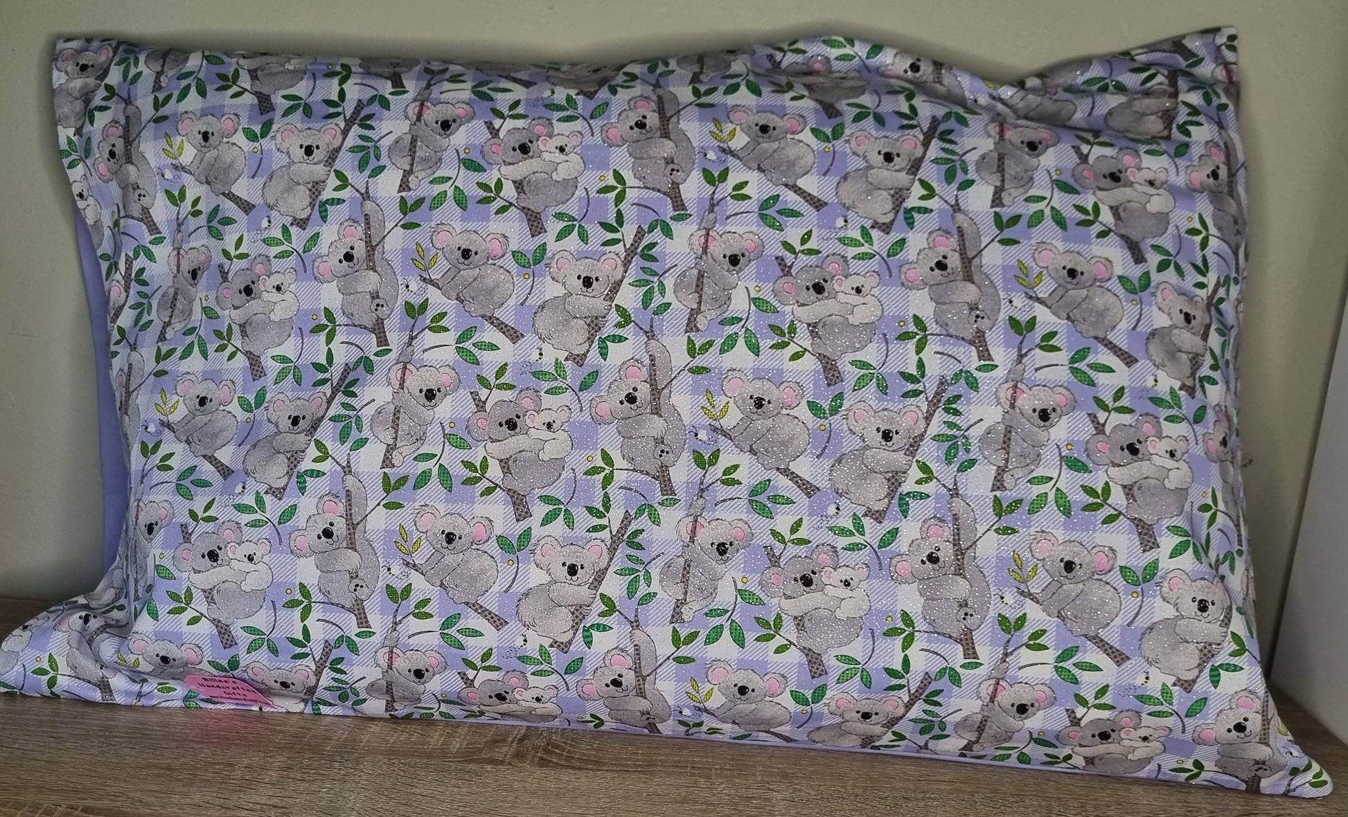 Standard sized Pillow case featuring glittery koalas with a purple back