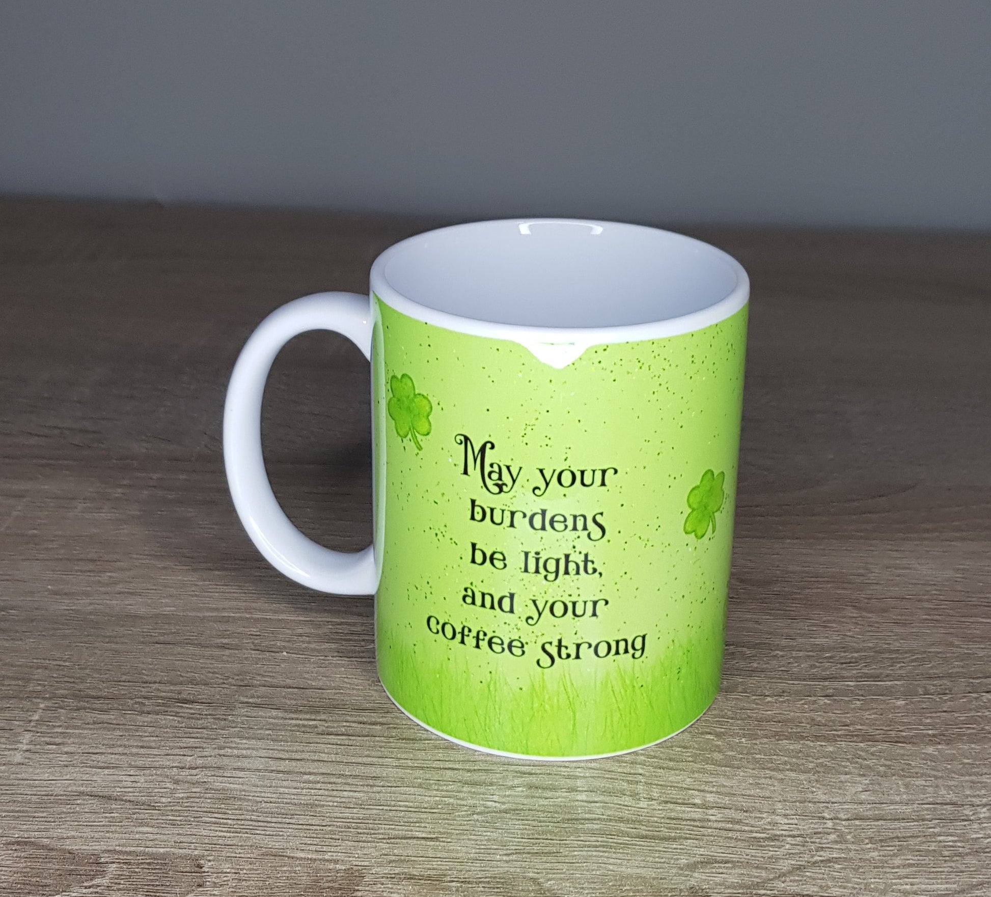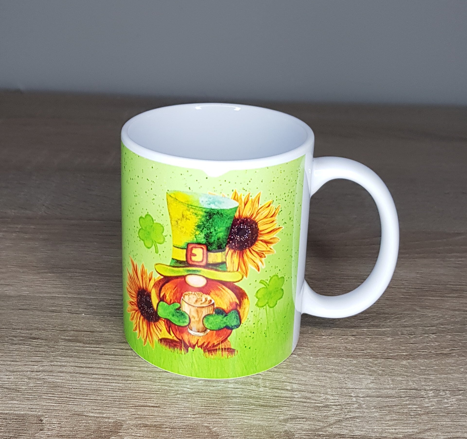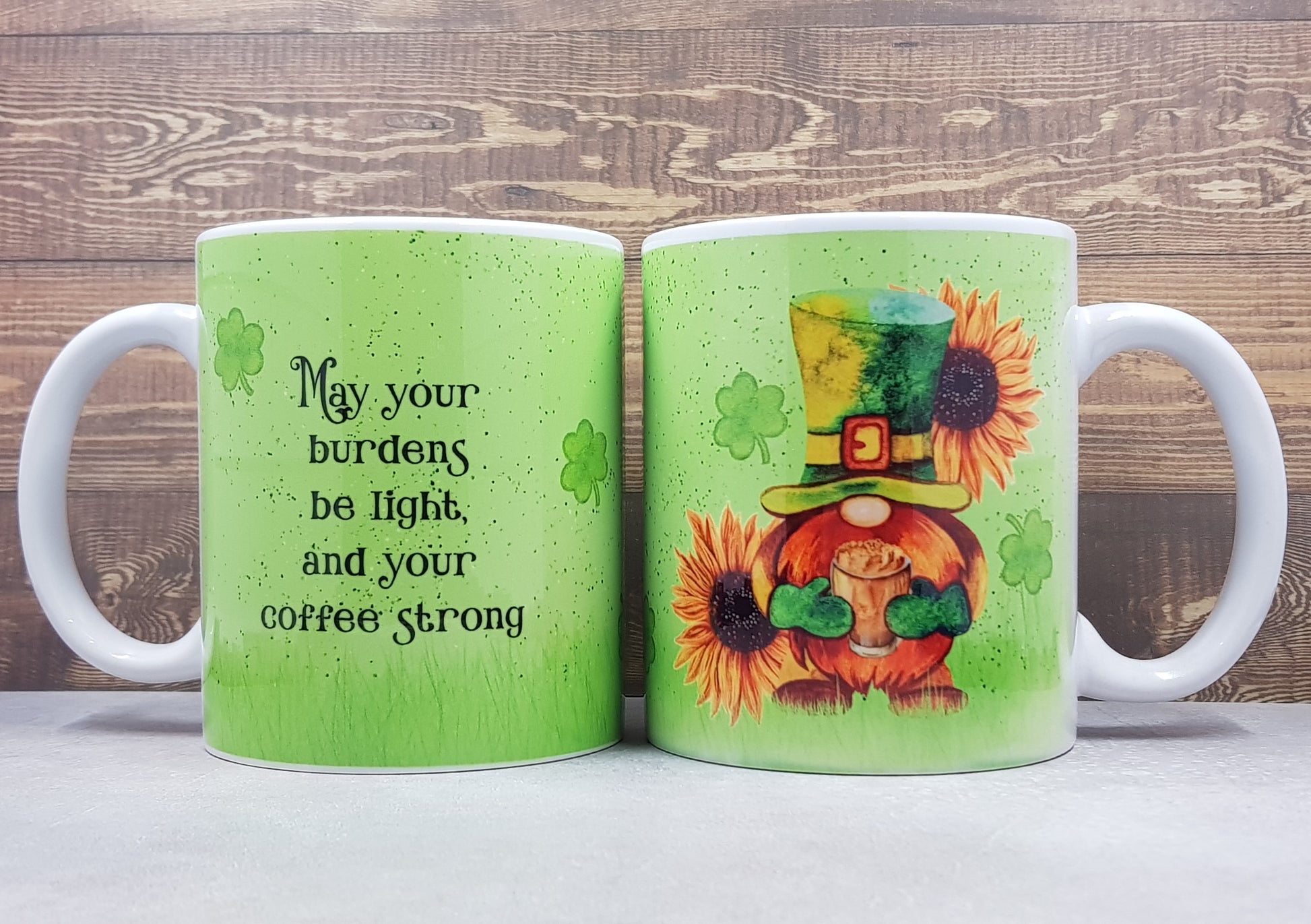 St Patrick's Gnome on a mug "May your burdens be light and your coffee strong"