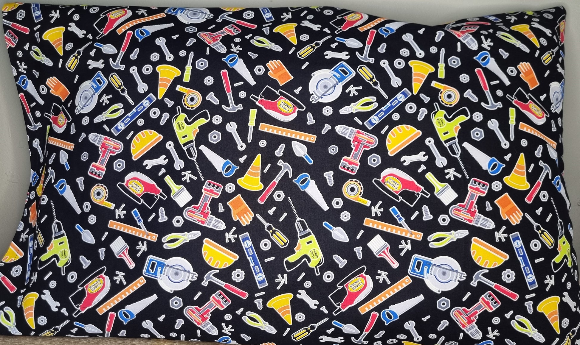 Tools with a glow in the dark out line around the tools on a standard sized pillow case